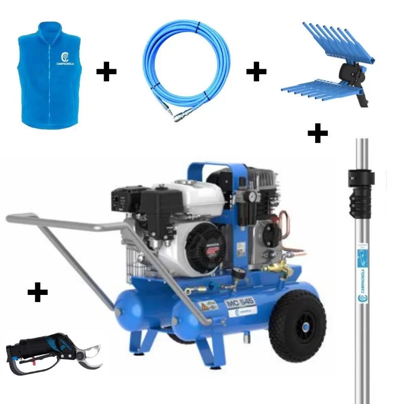 Il motocompressore a spinta MC 545 viene fornito con motore a benzina HONDA GP 160 da 4,8 HP. Ha un telaio bilanciato con due serbatoi da 11 litri che riducono l’effetto della condensa. Tutti i motocompressori di Campagnola sono dotati di un dispositivo di autoregolazione pneumatica che accelera il motore solo nella fase di ricarica del serbatoio, fino al raggiungimento della pressione massima. Ciò permette di risparmiare carburante, diminuire l’emissione di gas di scarico e limitare l’usura degli organi meccanici.