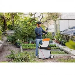 Biotrituratore elettrico compatto e silenzioso, con motore elettrico potente per lavori di triturazione occasionali con rami di resistenza media. Con allacciamento elettrico, apertura a quadrifoglio, contenitore per materiale triturato integrato e sistema a rulli silenzioso.