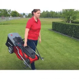 Il tagliaerba dispone di grandi ruote posteriori, che semplificano il lavoro su terreni difficili e salvaguardano il prato. Il sacco raccogli erba da 38 litri offre spazio necessario per un lavoro prolungato e dispone di un indicatore del livello di raccolta. La struttura robusta in plastica di alta qualità è particolarmente resistente agli urti. Il GC-EM 1536 è consigliato per superfici fino a 600 m².
